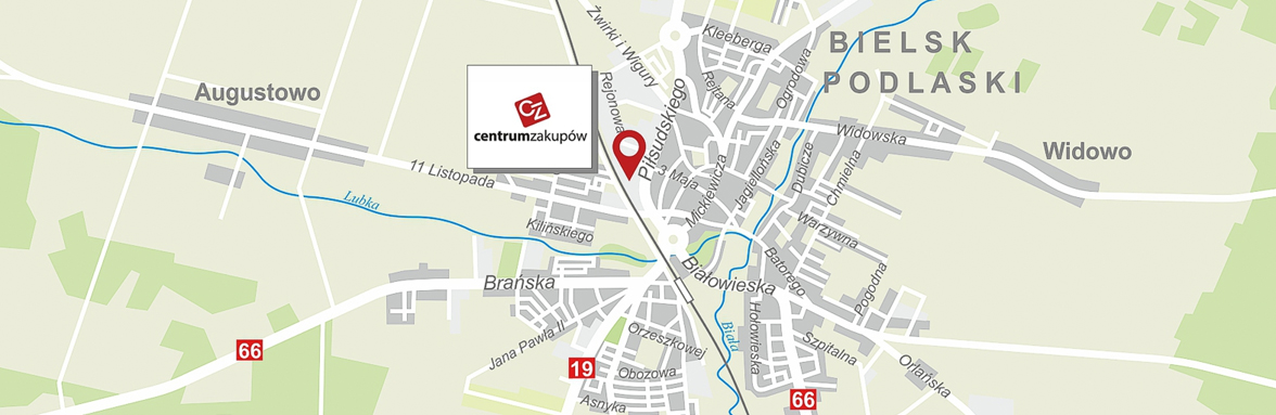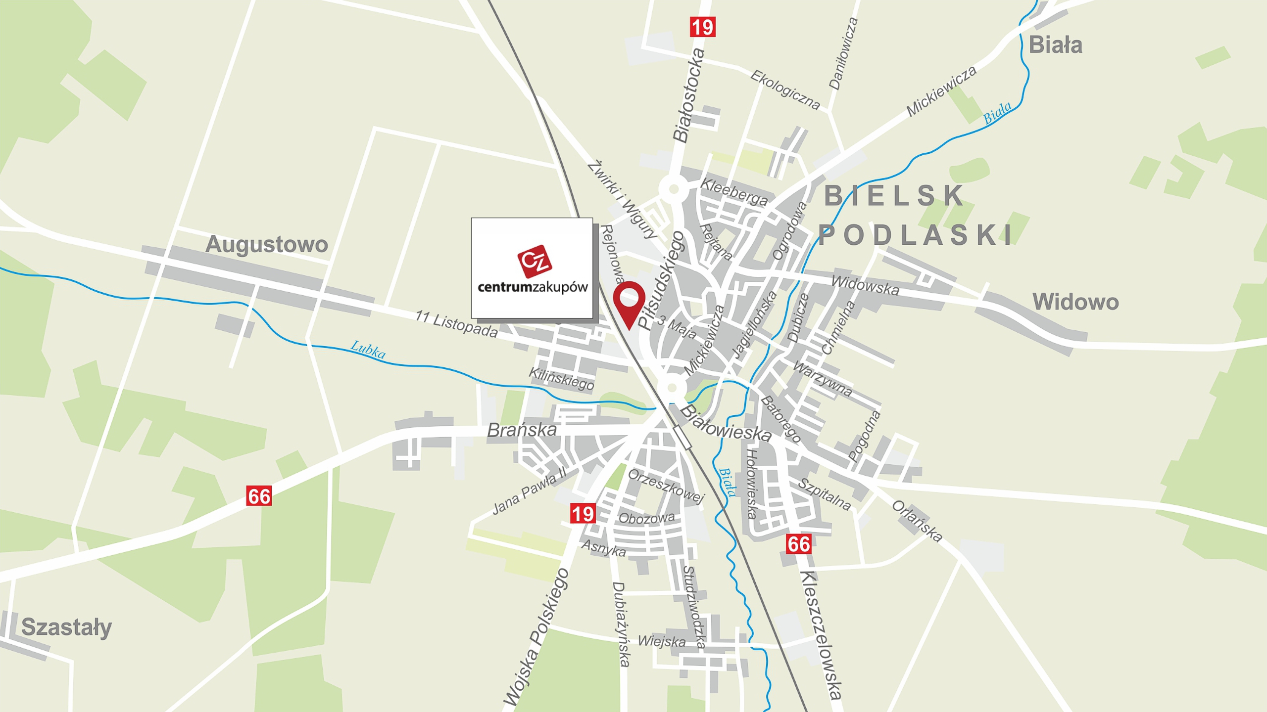 Park handlowy Centrum Zakupów Bielsk Podlaski zlokalizowany jest w centralnej części miasta, przy al. J. Piłsudskiego, która jest częścią drogi krajowej nr 19. Oferta centrum jest kompleksowa a jednocześnie zaaranżowana w kompaktowej i wygodnej formule sprzyjającej codziennym odwiedzinom. Każda z istotnych dla bieżących zakupów branż jest tu obecna, od mody, obuwia, akcesoriów poprzez asortyment sportowy, hobby, zdrowie i uroda, elektronikę, wyposażenie wnętrz po artykuły specjalistyczne, niemowlęce, dziecięce i zabawki.
