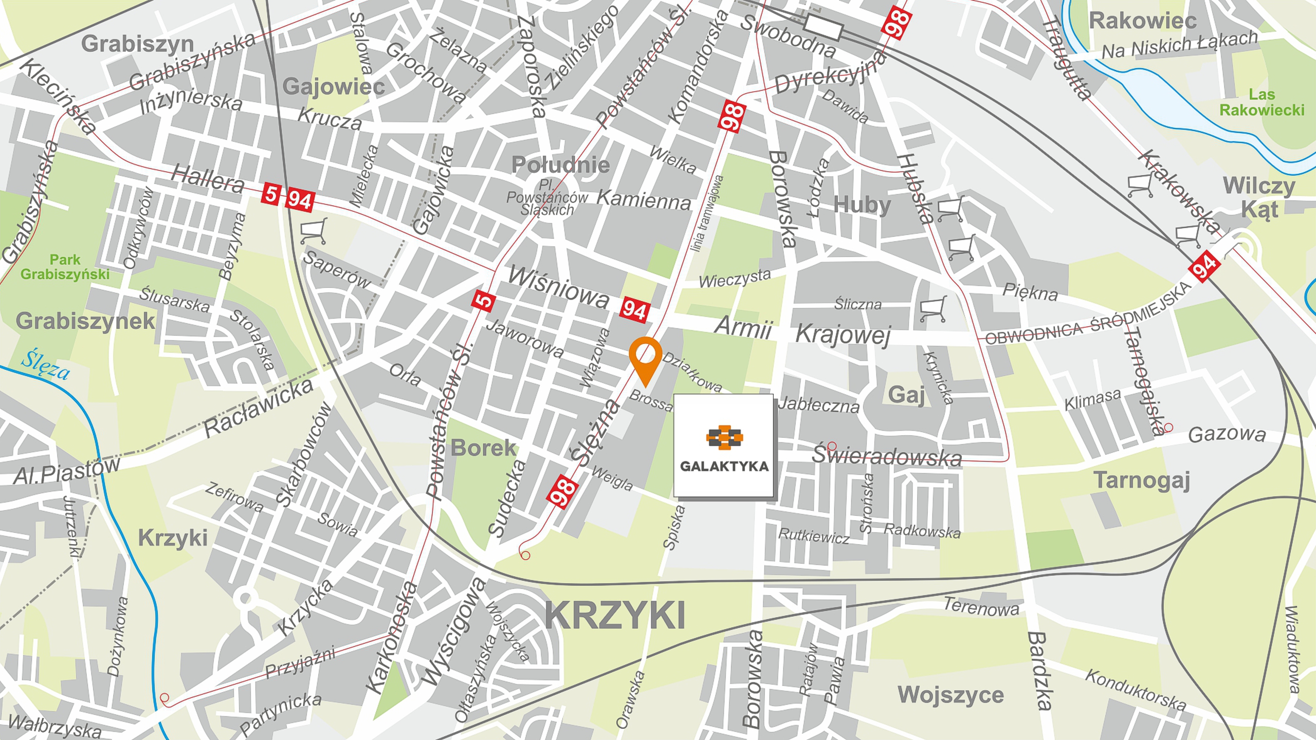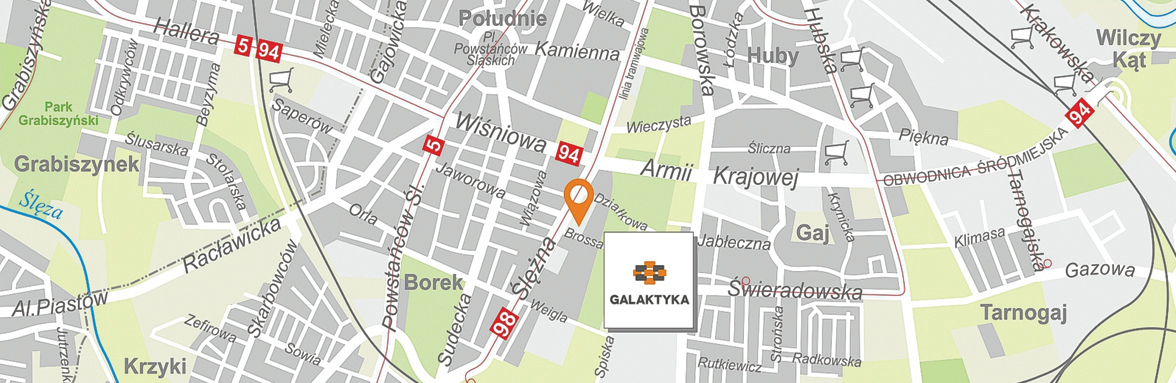 Park Galaktyka usytuowany jest w centrum wrocławskiej dzielnicy Krzyki-Borek, przy ul. Ślężnej, u zbiegu ul. Armii Krajowej i ul. Wiśniowej. Składa się z dwóch budynków. Ze względu na swoją lokalizację, przy jednej z głównych arterii komunikacyjnych Wrocławia, a jednocześnie w bezpośrednim sąsiedztwie osiedli mieszkaniowych, Galaktyka jest doskonałym miejscem zarówno na działalność biurową, specjalistyczne serwisy jak i na ofertę codziennych zakupów.